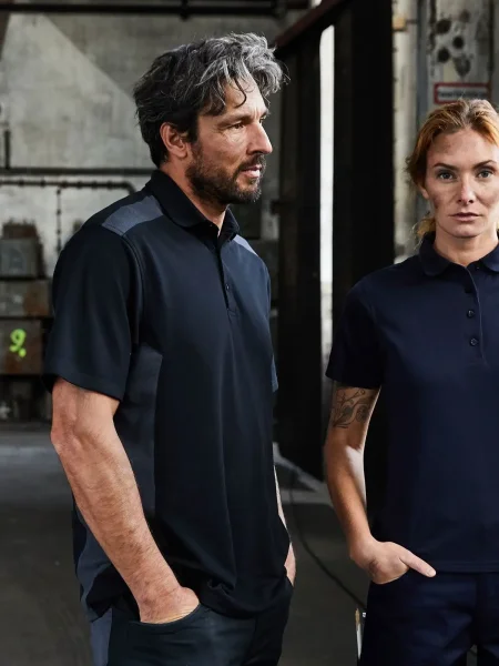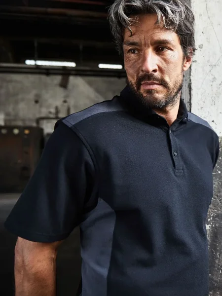 Polo easy-care, tessuto robusto, resistenza al lavaggio ottimale, inserti contrastanti su spalle e sui lati, colletto in maglia, nastro di rinforzo sul collo, pattina a 3 bottoni.