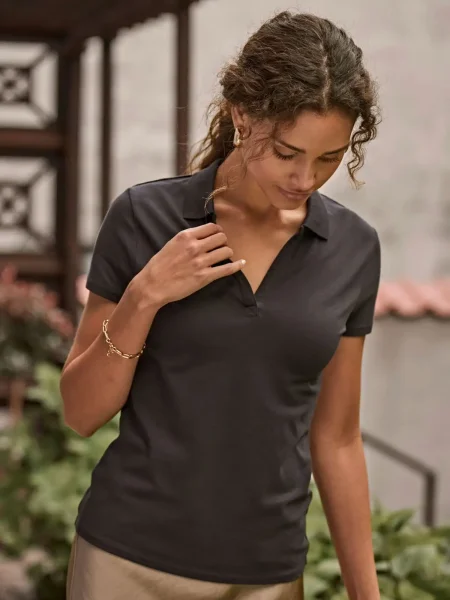 Polo donna Luxury Stretch V Teejays 95% cotone pettinato ring spun, 5% elastane. Polo con colletto a costine piatte in lycra, nastro di rinforzo sulle spalle, collo a V. Tessuto mini piqué, pre-ristretto due volte.