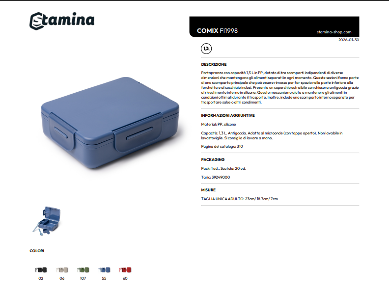 Portapranzo con capacità 1,3 L in PP, dotato di tre scomparti indipendenti di diverse dimensioni che mantengono gli alimenti separati in ogni momento. Queste sezioni fanno parte di uno scomparto principale che può essere rimosso per far spazio nella parte inferiore alla forchetta e al cucchiaio inclusi. Presenta un coperchio estraibile con chiusura antigoccia grazie al rivestimento interno in silicone. Questo meccanismo aiuta a mantenere gli alimenti in condizioni ottimali durante il trasporto. Inoltre, include uno scomparto interno separato per trasportare salse o altri condimenti.