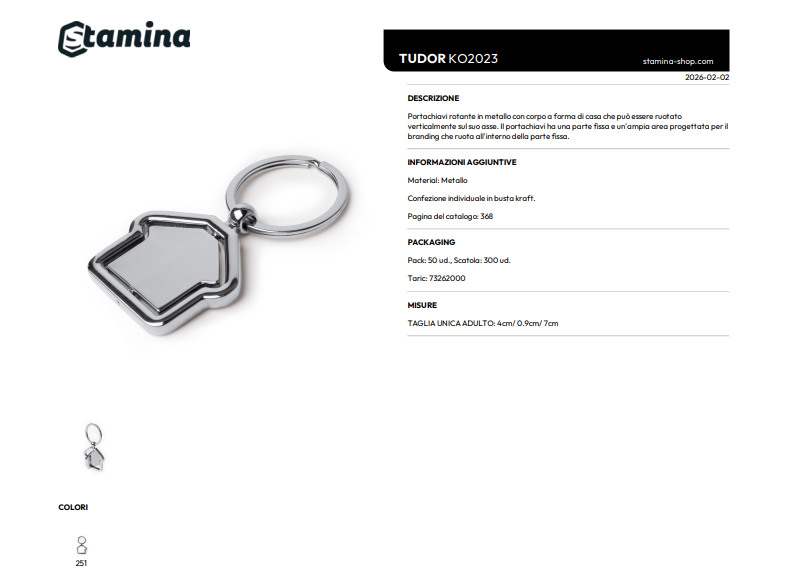 Portachiavi rotante in metallo con corpo a forma di casa che può essere ruotato verticalmente sul suo asse. Il portachiavi ha una parte fissa e un'ampia area progettata per il branding che ruota all'interno della parte fissa.