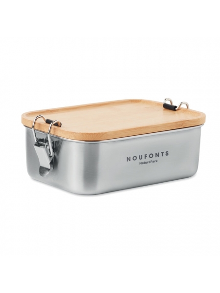 Porta pranzo acciaio inox con chiusure laterali e coperchio in bamboo. Portate con voi il pranzo, che sia per lavoro o una gita fuori porta. Portare con sé un pasto fatto in casa è un modo sano per godersi il pranzo. Con una capacità di 750 ml potete portare cibo sufficiente per un giorno. L'acciaio inossidabile e le chiusure laterali assicurano che il cibo rimanga sempre fresco. Il coperchio in bamboo conferisce un aspetto naturale ed elegante. Il bamboo è un prodotto naturale, potrebbero esserci leggere variazioni di colore e dimensione per articolo, che possono influenzare il risultato finale della personalizzazione