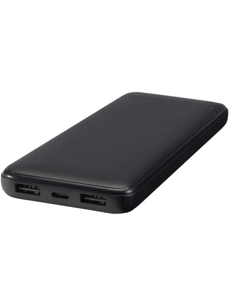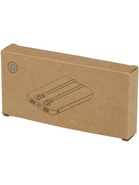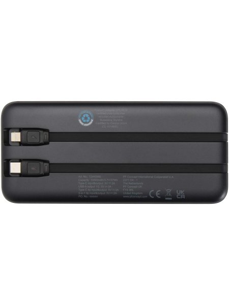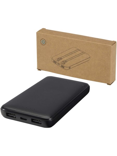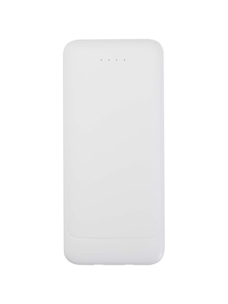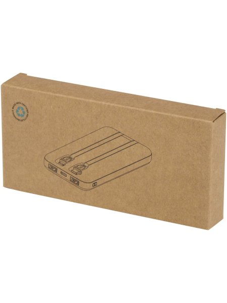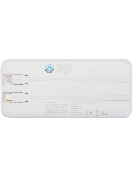 Power bank 10.000 mAh realizzato in plastica riciclata, compatto e dal design curato per unire praticità ed estetica. È dotato di due cavi integrati, uno Tipo-C e uno combinato Lightning/micro-USB, oltre a due porte USB-A e una porta Type-C che funziona sia da ingresso sia da uscita, offrendo diverse possibilità di ricarica. L’indicatore LED consente di monitorare facilmente il livello della batteria, rendendolo un accessorio affidabile per viaggi e utilizzo quotidiano.