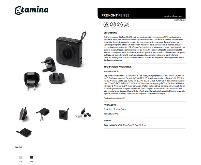 Batteria esterna 3 in 1 da 10.000 mAh a ricarica rapida, con potenza 15 W per la ricarica wireless e 20 W per la ricarica via cavo. Realizzata in ABS, con base di ricarica wireless per i dispositivi dotati di questa tecnologia. Include un cavo di connessione Type-C e un cavo Lightning integrato, oltre a un display con indicatore della percentuale di ricarica. Include porte di ingresso e di uscita USB e Type-C e adattatori di alimentazione per diversi paesi, che consentono di utilizzarla come caricatore da muro. Può essere utilizzata anche in modalità wireless come power bank. Include un anello magnetico, una tracolla in silicone per il trasporto e utilizzo più comodi, nonché una base di supporto posteriore integrata per il telefono cellulare. Il design e la struttura consentono di caricare più dispositivi contemporaneamente. Confezione di design.