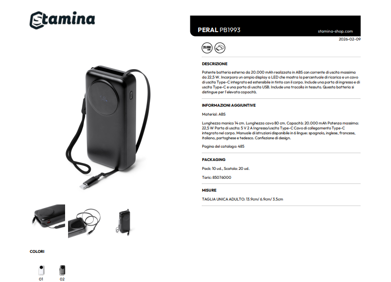 Potente batteria esterna da 20.000 mAh realizzata in ABS con corrente di uscita massima da 22,5 W. Incorpora un ampio display a LED che mostra la percentuale di ricarica e un cavo di uscita Type-C integrato ed estensibile in tinta con il corpo. Include una porta di ingresso e di uscita Type-C e una porta di uscita USB. Include una tracolla in tessuto. Questa batteria si distingue per l'elevata capacità.