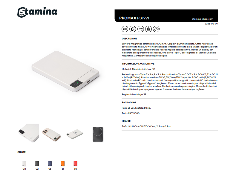 Batteria magnetica esterna da 5.000 mAh. Corpo in alluminio riciclato. Offre ricarica via cavo con uscita fino a 20 W e ricarica rapida wireless con uscita da 15 W per i dispositivi dotati di questa tecnologia, consentendo la ricarica rapida del dispositivo. Include un display con indicatore della percentuale di ricarica, una porta Type-C per l'ingresso e l'uscita e un anello magnetico. Confezione con design ecologico.