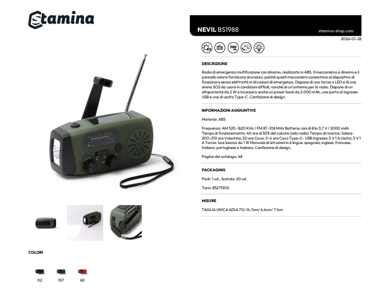 Radio di emergenza multifunzione con dinamo, realizzata in ABS. Il meccanismo a dinamo e il pannello solare forniscono sicurezza, poiché questi meccanismi consentono al dispositivo di funzionare senza elettricità in situazioni di emergenza. Dispone di una torcia a LED e di una sirena SOS da usare in condizioni difficili, nonché di un'antenna per la radio. Dispone di un altoparlante da 2 W e incorpora anche un power bank da 2.000 mAh, una porta di ingresso USB e una di uscita Type-C. Confezione di design.
