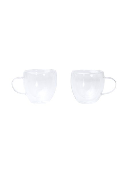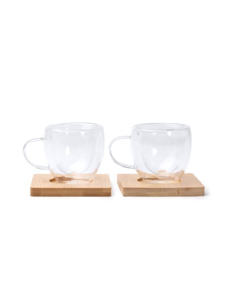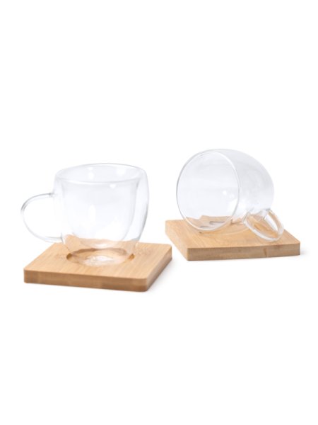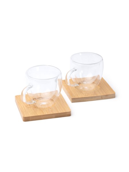 Set da caffè composto da due tazze in vetro a doppia parete e due sottobicchieri quadrati in bambù. La doppia parete della tazza garantisce isolamento termico, rendendola più comoda da usare. Ogni tazza ha una capacità di 90 ml.