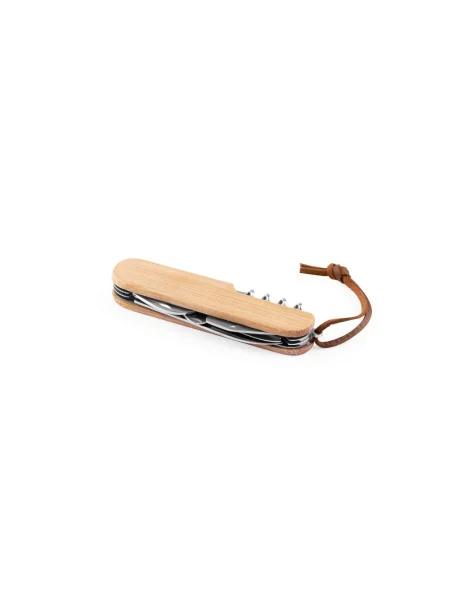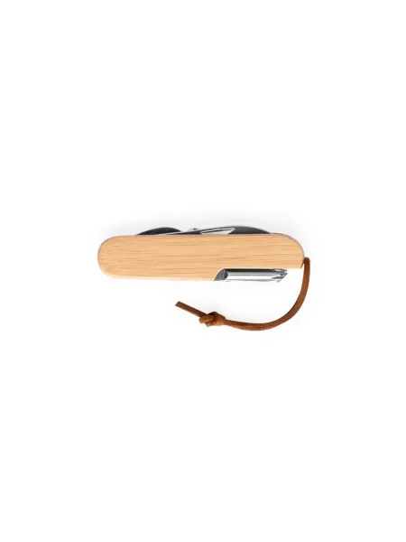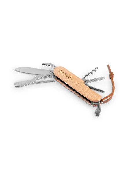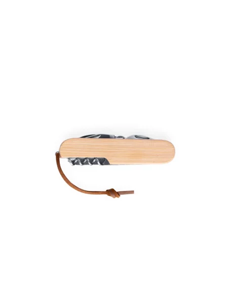 Coltello tascabile multifunzionale in bambù e acciaio inossidabile con cordino in PU per un facile trasporto e stoccaggio. Include 7 funzioni: lama, forbici, cavatappi, cacciavite, apriscatole e apribottiglie e lima per unghie. Fornito in una scatola regalo di carta kraft. Poiché il prodotto è realizzato con materiali naturali, il colore del prodotto e il risultato della stampa possono variare da un prodotto all'altro. 94 x 24 x 15 mm | Box: 30 x 20 x 95 mm