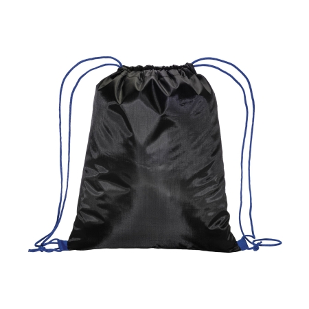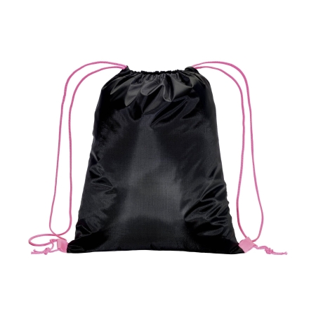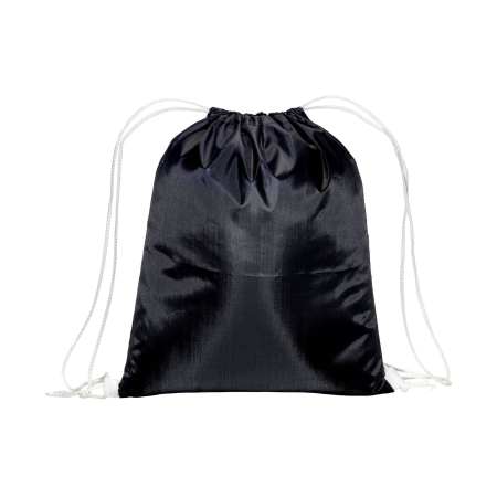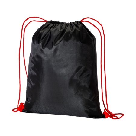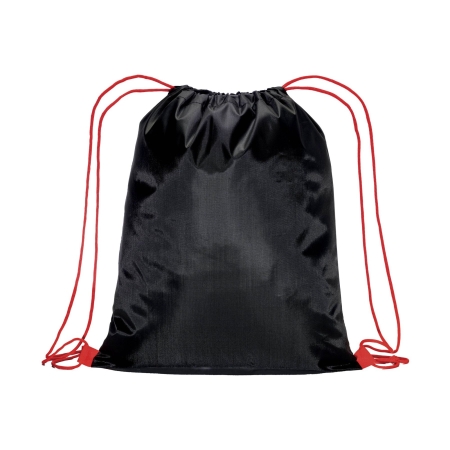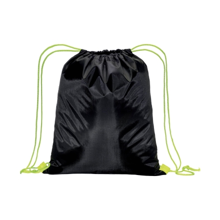Zainetto nero in poliestere 210T. Dotato di chiusu-ra a strozzo con doppi cordini colorati fissati con asola.