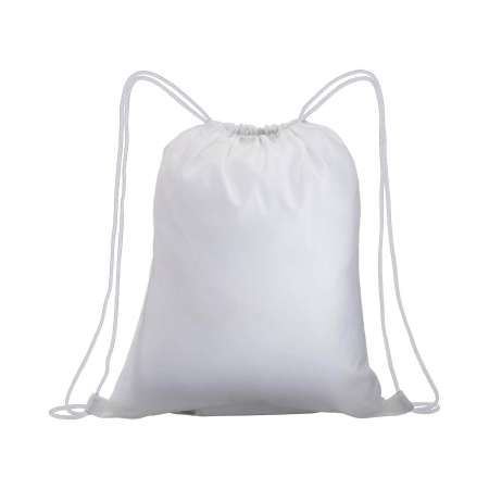 Zainetto a tinta unita in poliestere 210T. Dotato di chiusura a strozzo con doppi cordini colorati fissati con asola. Il colore bianco è adatto per la stampa in sublimazione.