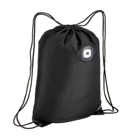 Zainetto nero con luce LED COB in poliestere 300D. Dotato di luce removibile e ricaricabile trami-te USB, angoli rinforzati, anelli metallici e chiusura a strozzo con doppi cordini nero.