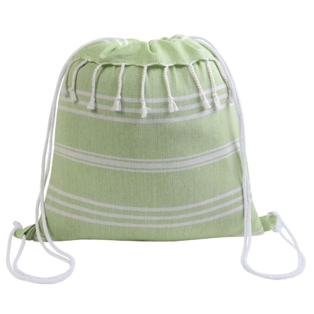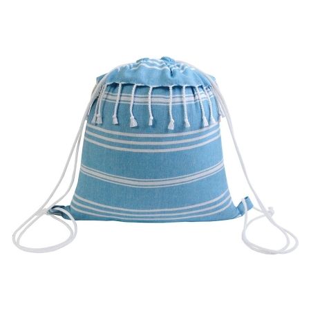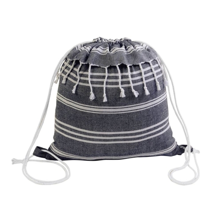 Zainetto in cotone da 180 g/m² con effetto fouta e fantasia a righe. Dotato di frange nella parte superiore, chiusura a strozzo con doppi cordini bianchi fissati con asola.