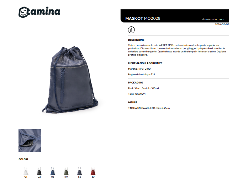 Zaino con coulisse realizzato in RPET 210D con tessuto in mesh sulla parte superiore e posteriore. Dispone di una tasca anteriore esterna per gli oggetti più piccoli e di una fascia anteriore catarifrangente. Questa tasca include un tiralampo in tinta con lo zaino. Opzione pratica e leggera.