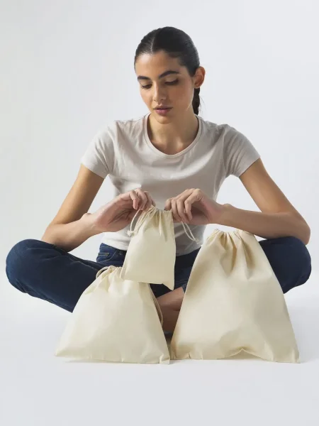 Sacchetto realizzato in 100% cotone organico, perfetto per un uso sostenibile e versatile. Dotato di cordino doppio in colore naturale per una chiusura pratica e sicura, è ideale per confezioni regalo, packaging ecologico o per contenere piccoli oggetti.