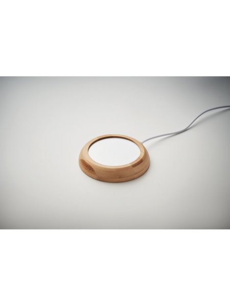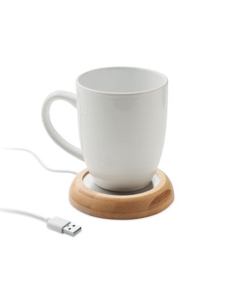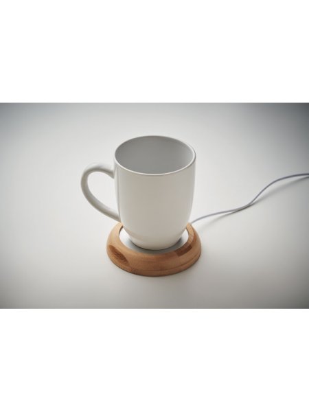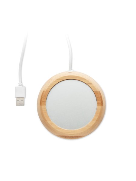 Scaldatazze in bambù. Mantiene le bevande calde fino a un massimo di 45ºC. È dotato di un cavo di collegamento USB.