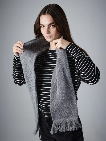 Sciarpa in tessuto a maglia a doppio strato, finiture di nappina. Dimensioni: 152 x 18 cm. Heather Grey: 55% poliestere 45% acrilico.