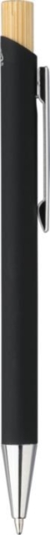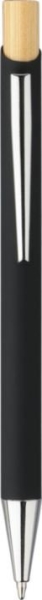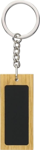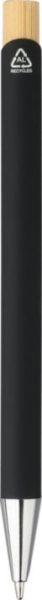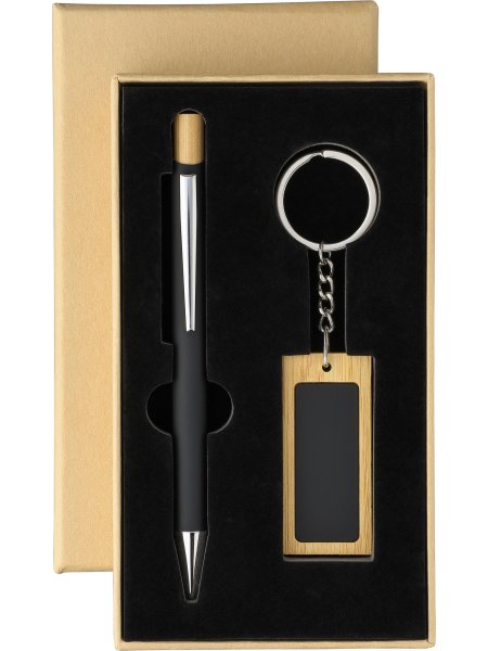 Set da scrittura composto da una penna a sfera in bambù ed alluminio riciclato, con finitura gommata, refill blu, meccanismo a scatto con pulsante in bambù e punta in plastica cromata; e da un portachiavi rettangolare in bambù e acciaio inox gommato. Entrambi gli articoli presentano un effetto specchio dopo l’incisione laser e includono il logo dell’alluminio riciclato. Confezionati in una scatola in carta kraft con inserto in velluto.