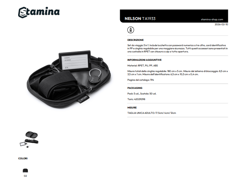 Set da viaggio 3 in 1. Include lucchetto con password numerica a tre cifre, card identificativa in PP e cinghia regolabile per una maggiore sicurezza. Tutti questi accessori sono presentati in una custodia in RPET con chiusura a zip a tutta apertura.
