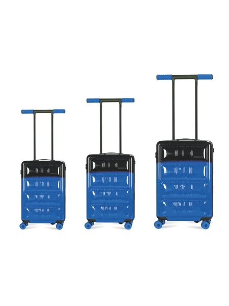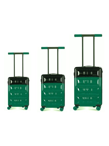 Set trolley in alluminio e ABS, con manico per il trasporto con inserti colorati e 4 ruote in tinta. Chiusura con zip, maniglia piatta sulla parte superiore e maniglia laterale solo su M/L. Fodera interna nera, 2 tasche interne, 2 cinghie elastiche per vestiti.