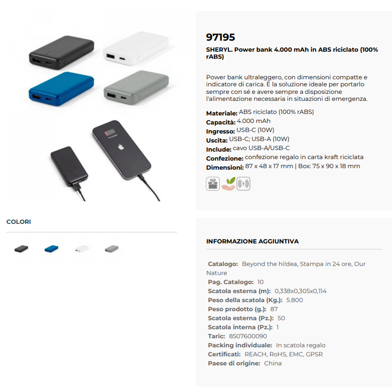 Power bank 4000 mAh in ABS riciclato ultra compatto SHERYL