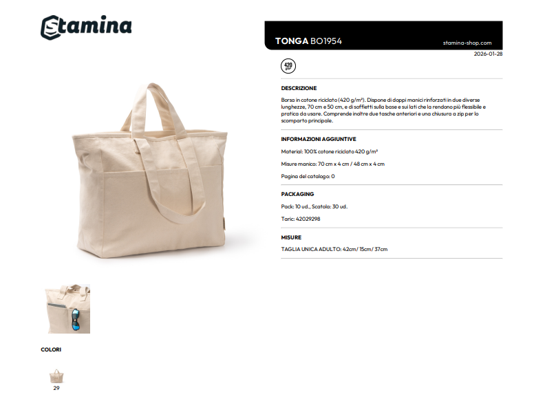 Borsa in cotone riciclato (420 g/m²). Dispone di doppi manici rinforzati in due diverse lunghezze, 70 cm e 50 cm, e di soffietti sulla base e sui lati che la rendono più flessibile e pratica da usare. Comprende inoltre due tasche anteriori e una chiusura a zip per lo scomparto principale.