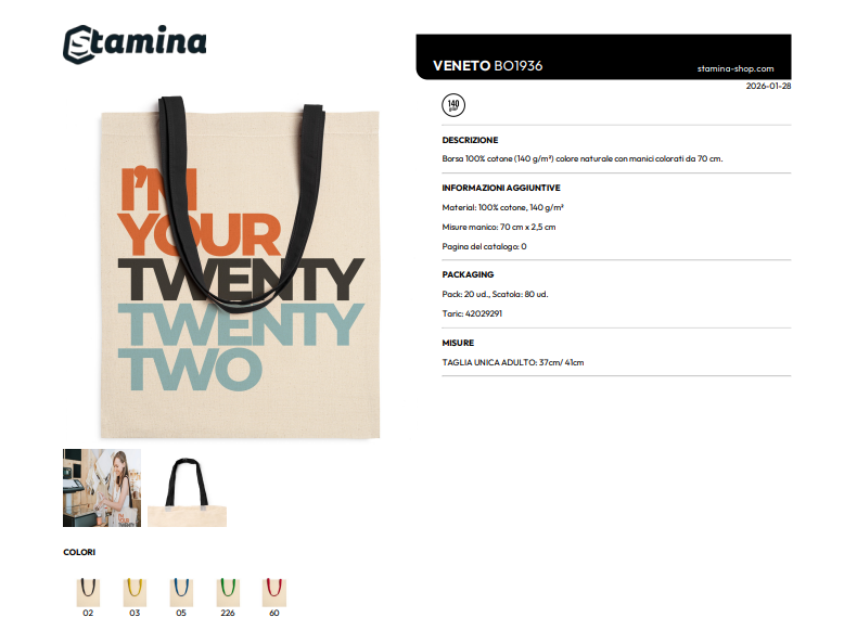 Borsa 100% cotone (140 g/m²) colore naturale con manici colorati da 70 cm.