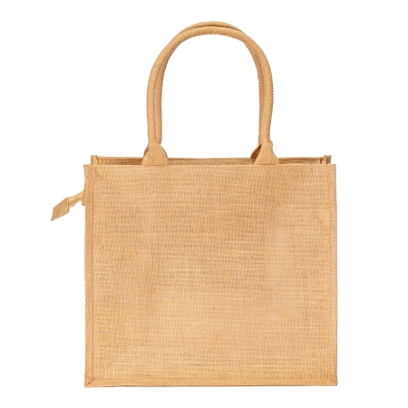 Borsa in juta con manici in cotone, pratica e resistente, pensata per un utilizzo quotidiano. È dotata di chiusura a zip, tasca interna e soffietto per maggiore capienza. I manici lunghi consentono di portarla comodamente sia a mano che a spalla.