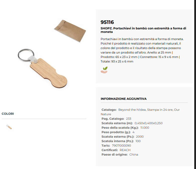 Portachiavi in bambù con estremità a forma di moneta, un prodotto ecologico e naturale. Realizzato con materiali naturali, il colore e il risultato della stampa possono variare da un prodotto all'altro. Dotato di un anello da 25 mm e connettore di 15 x 9 x 6 mm, offre un design elegante e pratico. Le dimensioni totali sono 93 x 25 x 6 mm. Perfetto per chi cerca un accessorio sostenibile e versatile.