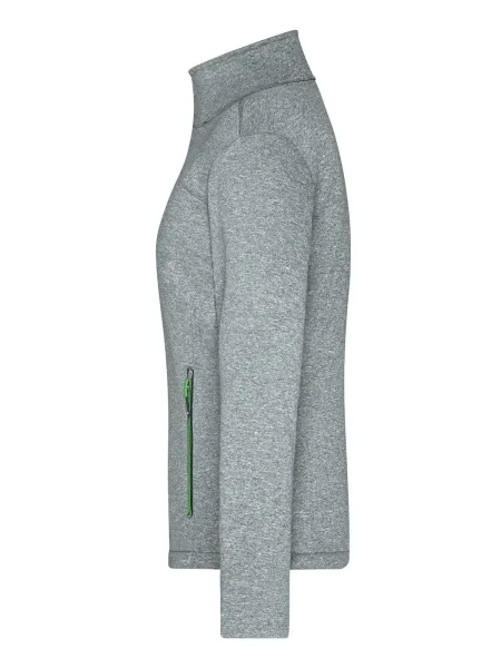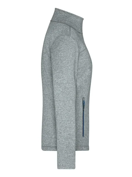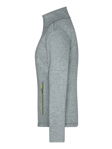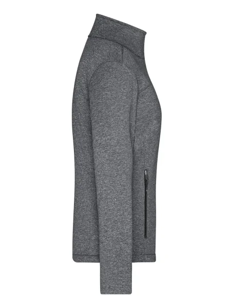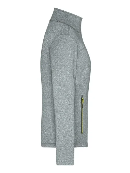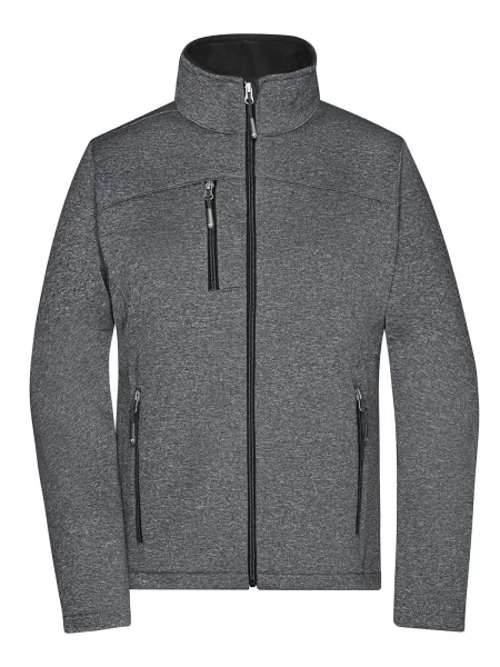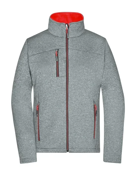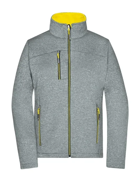 Giacc softshell donna a 2 strati, parte interna in pile di colore contrastante. Cerniera frontale nascosta con protezione per il mento, collo alto, 2 tasche laterali e 1 tasca sul petto con cerniera, leggermente sfiancata.