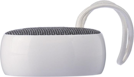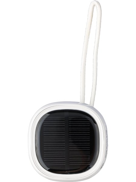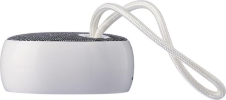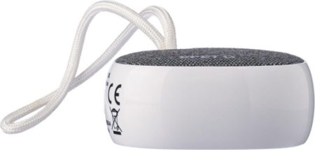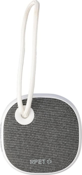 Speaker wireless in ABS riciclato e tessuto rPET con piccolo cavo di trasporto in nylon, capacità della batteria 300 mAh con uscita da 3W, tecnologia wireless versione 5.3 e raggio d'azione di 10 metri, tempo di ricarica di circa 2 ore con un tempo di riproduzione di 2-3 ore, include un cavo di ricarica USB-C bianco da 30 cm, logo rPET sul tessuto e logo ABS riciclato sul lato, confezionato singolarmente in una scatola di cartone avana.