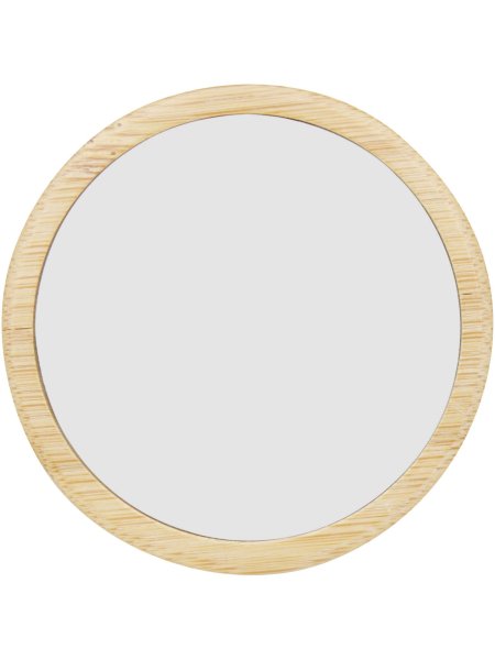 Specchietto da borsa personalizzato, forma rotonda, realizzato in bambù. Pratico e compatto, è fornito in un sacchettino di cotone.