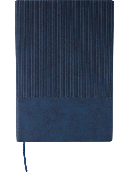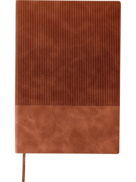 Taccuino in PU riciclato, formato +/- A5, copertina rigida e finitura effetto velluto a coste sulla parte superiore frontale e sul retro, include segnalibro e 100 pagine a righe in carta da 80 g/m². Presenta logo materiale riciclato in rilievo sul retro.