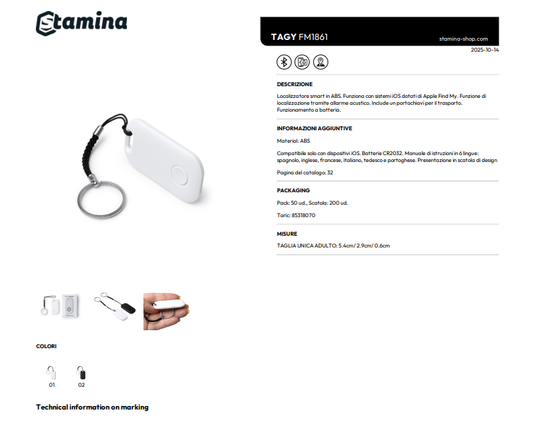 Localizzatore smart in ABS. Funziona con sistemi iOS dotati di Apple Find My. Funzione di localizzazione tramite allarme acustico. Include un portachiavi per il trasporto. Funzionamento a batteria.