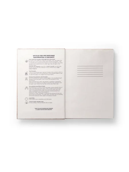 Block notes A5 con copertina flessibile fabbricata tramite gli scarti delle foglie di tè (65%) ed scarti di cotone (35%). La carta interna è fabbricata tramite gli scarti del cotone (100%) ed è altamente resistente. Contiene 120 pagine lisce lisce e fascia in carta stampata. Non sono stati utilizzati processi chimici o alberi nel processo di produzione di questo block notes. Poiché il prodotto è realizzato con materiali naturali, il colore del prodotto e il risultato della stampa possono variare da un prodotto all'altro. 140 x 200 mm