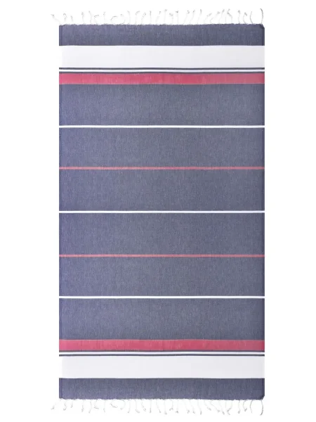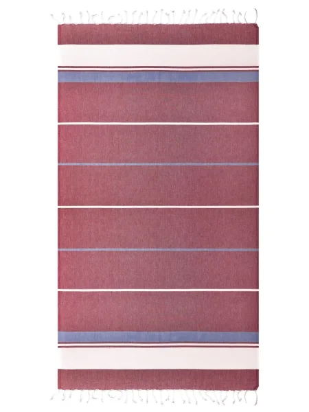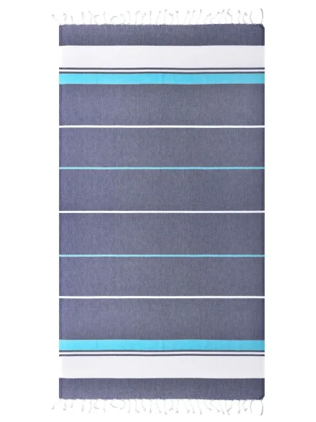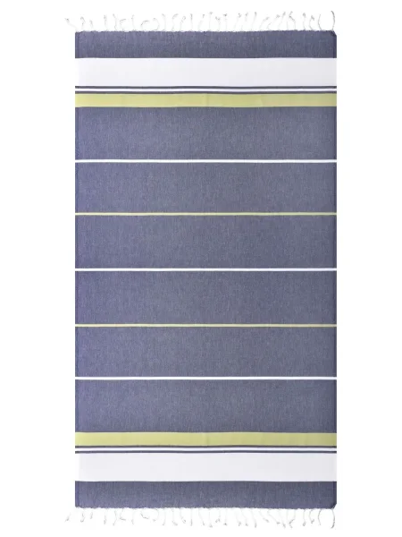 Telo multifunzionale per la spiaggia e varie attività all'aperto, design a strisce, bordi lunghi orlati, termina con cordini. Misura: 95 x 180 cm.