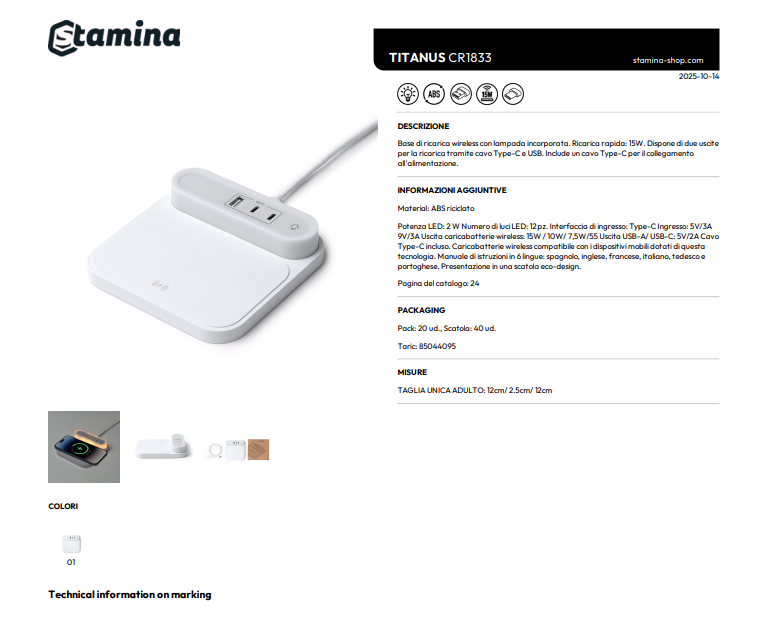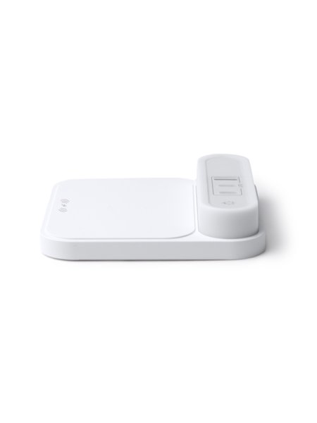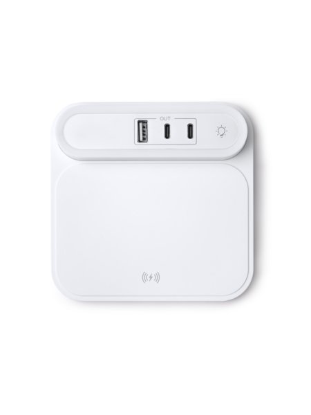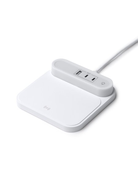 Base di ricarica wireless con lampada incorporata. Ricarica rapida: 15W. Dispone di due uscite per la ricarica tramite cavo Type-C e USB. Include un cavo Type-C per il collegamento all'alimentazione.