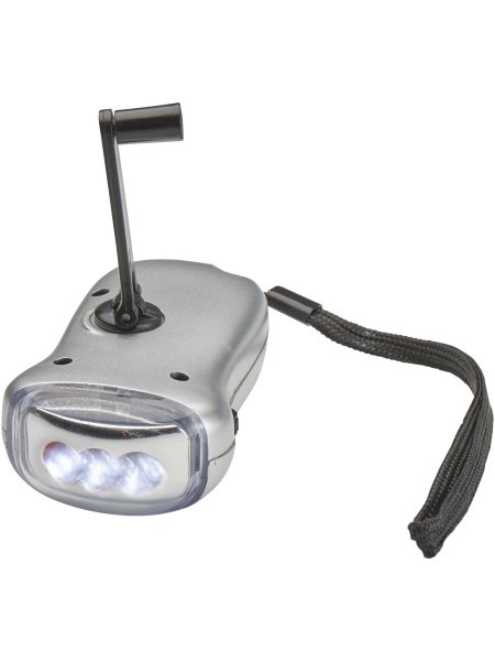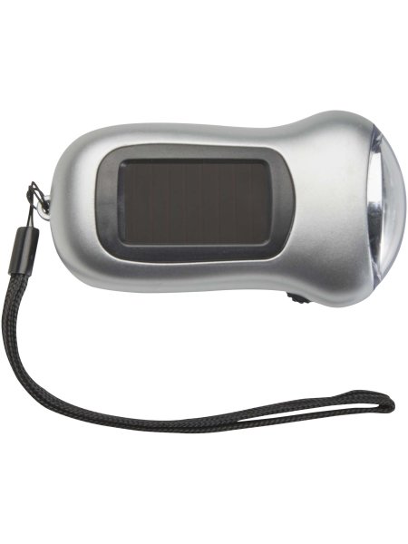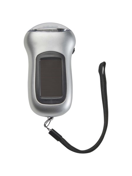 Torcia a energia solare compatta con una luminosità di 10.000 mcd. La torcia può essere alimentata anche manualmente ruotando l'impugnatura.