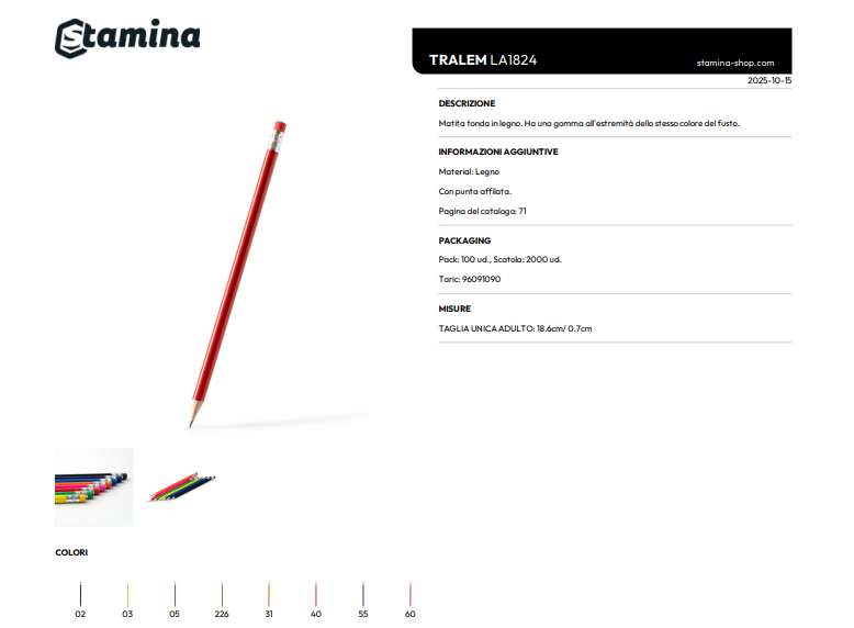 Matita in legno tonda con gomma all’estremità, abbinata al colore del fusto per un aspetto armonioso e curato. Classica e funzionale, è ideale per la scrittura quotidiana, la scuola o l’ufficio, offrendo un equilibrio perfetto tra semplicità e praticità.