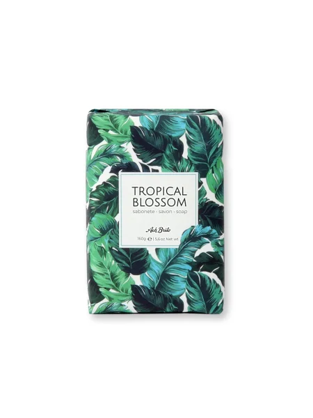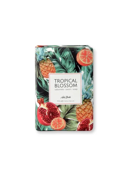 Saponette Tropical Blossom a base di sapone vegetale ed eleganti fragranze arricchite con olio d'oliva - caratterizzato da proprietà idratanti. Quando viene utilizzato, crea una schiuma cremosa che lascia la pelle pulita, purificata e leggermente profumata. Prodotto tradizionalmente in Portogallo e adatto a tutti i tipi di pelle. Unità di 160 g. Prodotto ecologico.Colore 128: linea fruttaColore 129: linea foglie. 90 x 60 x 30 mm