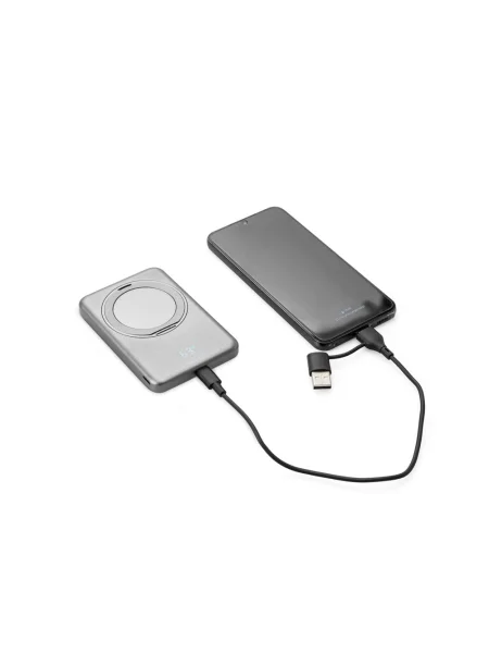 Power bank magnetico con design sottile e ricarica wireless superveloce, realizzato in ABS riciclato (100% rABS). Dotato di anello di supporto ruotabile a 360° che consente di posizionare il dispositivo mobile in modo comodo e stabile. Offre una capacità di 5.000 mAh e una potenza di ricarica wireless da 15W, con doppia porta USB-C (PD 20W) per ingresso e uscita. Include presa magnetica extra e cavo di ricarica USB-C con adattatore USB-A/USB-C. Fornito in confezione regalo in carta kraft riciclata.