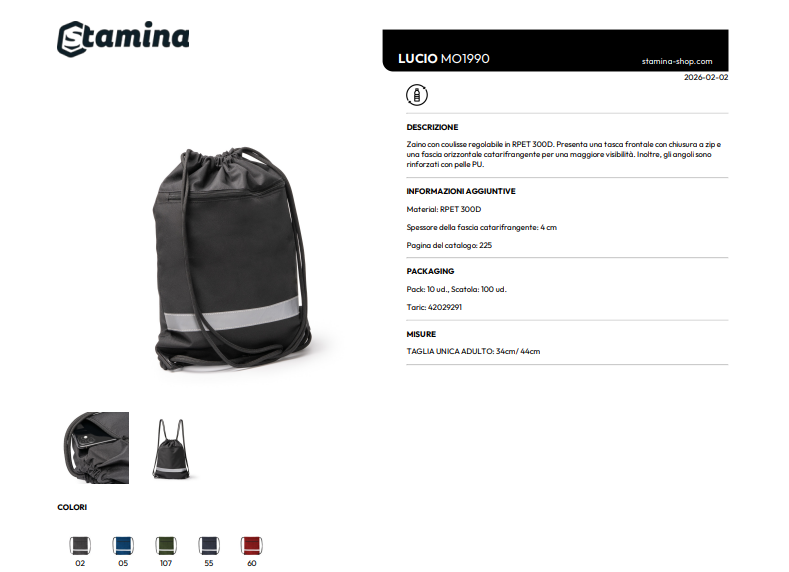 Zaino con coulisse regolabile in RPET 300D. Presenta una tasca frontale con chiusura a zip e una fascia orizzontale catarifrangente per una maggiore visibilità. Inoltre, gli angoli sono rinforzati con pelle PU.