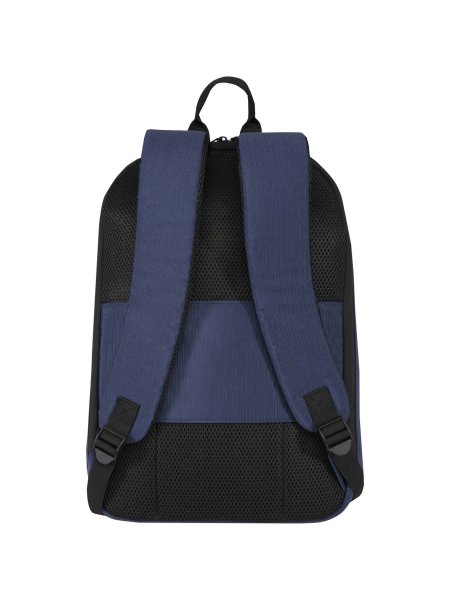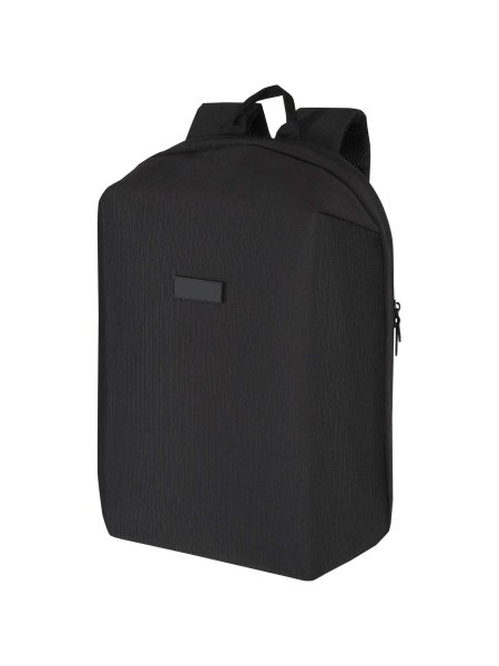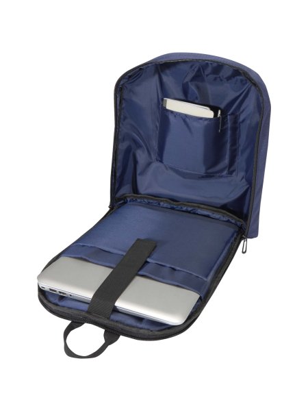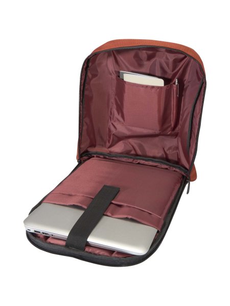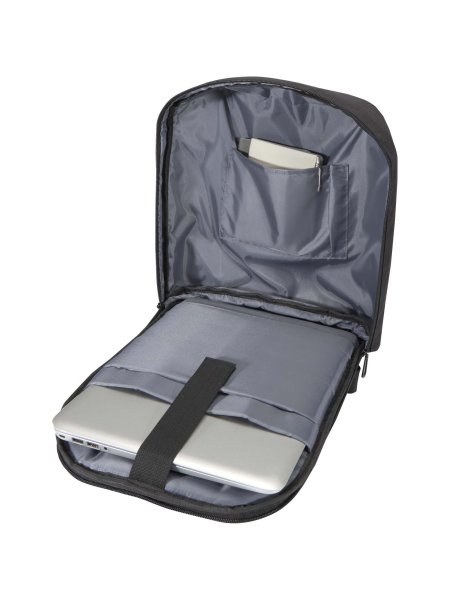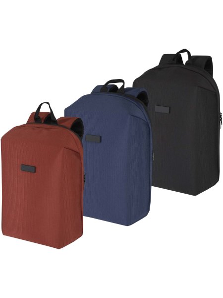 Realizzato in poliestere jacquard riciclato con una fodera in PET riciclato con colori abbinati, lo zaino antifurto Luma per portatile da 15" combina sicurezza intelligente e stile elegante per chi è sempre in movimento. Le caratteristiche antifurto includono cerniere bloccabili (lucchetto non incluso) e una tasca posteriore nascosta che si trasforma in cinghia per il trolley. Il tessuto è anche idrorepellente per proteggere gli oggetti personali dalla pioggia leggera. All'interno, si trova uno scomparto imbottito per portatili fino a 15", una tasca per il tablet, una tasca aperta con un passante per penna e un ulteriore spazio organizzato per tenere in ordine gli oggetti essenziali. Il design presenta anche spallacci imbottiti, un pannello posteriore traspirante e placche di metallo sulla parte anteriore. Lo zaino Luma offre comfort per tutto il giorno ed è adatto per andare a lavoro in bicicletta, spostarsi all'interno di un aeroporto affollato o per andare a lezione.