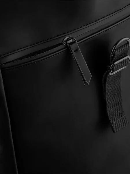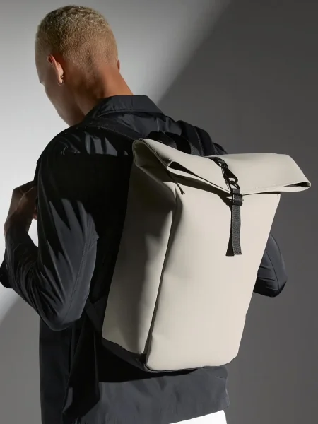 Zaino roll-top privo di PVC, realizzato in tessuto idrorepellente. Presenta una tasca interna imbottita compatibile con laptop fino a 15,6", ideale per proteggere i dispositivi. Con uno stile minimalista, è dotato di una tasca frontale con cerniera e un pannello di base a doppio strato per una maggiore durata. La chiusura roll-top con clip sicura garantisce la massima protezione degli oggetti personali. Le bretelle imbottite e regolabili, insieme al manico, offrono un trasporto comodo. Include un'etichetta removibile per facilitare il rebranding.