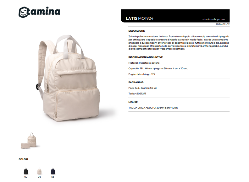 Zaino in poliestere e cotone. La tasca frontale con doppia chiusura a zip consente di ripiegarlo per ottimizzare lo spazio e consente di riporlo ovunque in modo facile. Include uno scomparto principale e due scomparti anteriori per gli oggetti più piccoli, tutti con chiusura a zip. Dispone di doppi manici per il trasporto nella parte superiore e di bretelle imbottite regolabili, nonché di due scomparti laterali per trasportare le bottiglie.