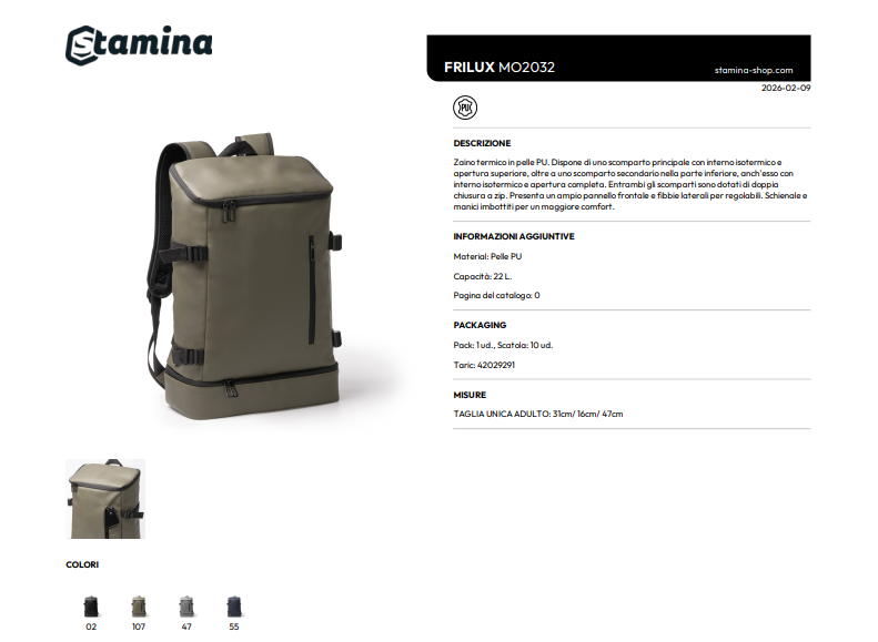Zaino termico in pelle PU. Dispone di uno scomparto principale con interno isotermico e apertura superiore, oltre a uno scomparto secondario nella parte inferiore, anch'esso con interno isotermico e apertura completa. Entrambi gli scomparti sono dotati di doppia chiusura a zip. Presenta un ampio pannello frontale e fibbie laterali per regolabili. Schienale e manici imbottiti per un maggiore comfort.