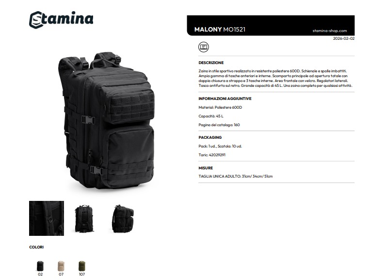 Zaino in stile sportivo realizzato in resistente poliestere 600D. Schienale e spalle imbottiti. Ampia gamma di tasche anteriori e interne. Scomparto principale ad apertura totale con doppia chiusura a strappo e 3 tasche interne. Area frontale con velcro. Regolatori laterali. Tasca antifurto sul retro. Grande capacità di 45 L. Uno zaino completo per qualsiasi attività.