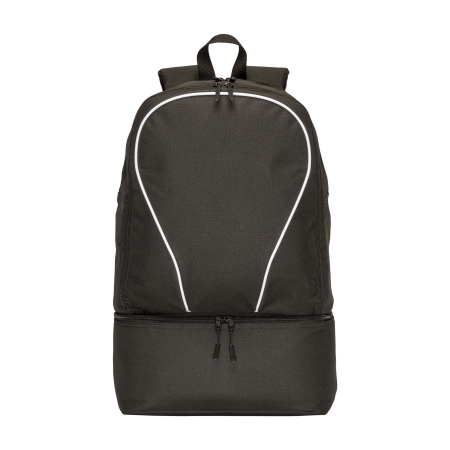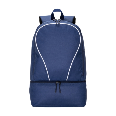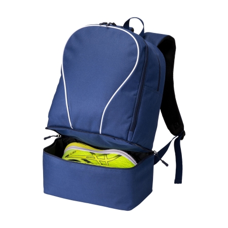 Zaino sport in poliestere 600D, ampio scomparto principale e tasca frontale accessoriata. Spallacci imbottiti regolabili e vano porta scarpe imbottito. Con tasca trasparente porta etichetta sullo schienale.