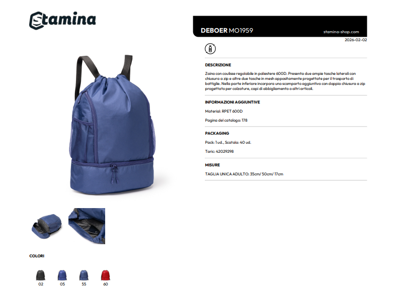 Zaino con coulisse regolabile in poliestere 600D. Presenta due ampie tasche laterali con chiusura a zip e altre due tasche in mesh appositamente progettate per il trasporto di bottiglie. Nella parte inferiore incorpora uno scomparto aggiuntivo con doppia chiusura a zip progettato per calzature, capi di abbigliamento o altri articoli.