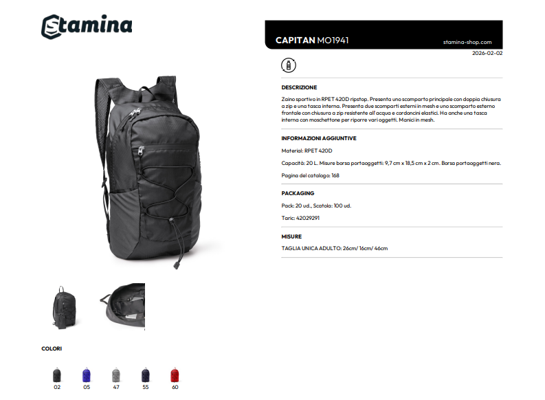 Zaino sportivo in RPET 420D ripstop 20L. Presenta uno scomparto principale con doppia chiusura a zip e una tasca interna. Presenta due scomparti esterni in mesh e uno scomparto esterno frontale con chiusura a zip resistente all'acqua e cordoncini elastici. Ha anche una tasca interna con moschettone per riporre vari oggetti. Manici in mesh.